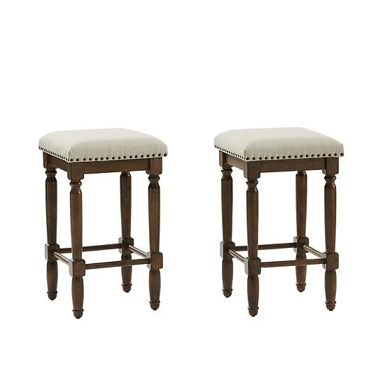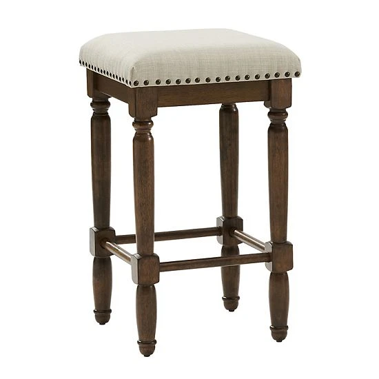 - Square backless upholstered seat with antique brass finish to nailhead trim